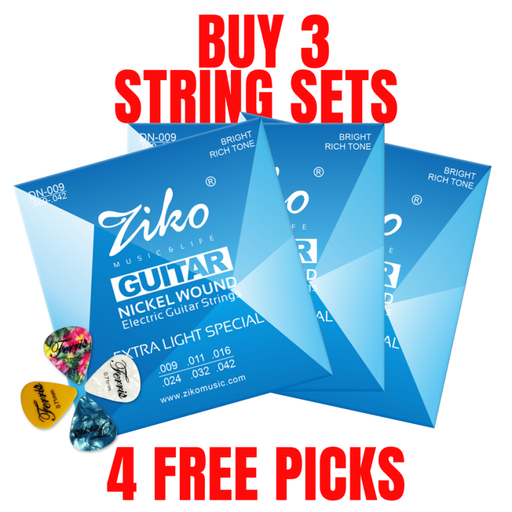 3 Pack Free Picks Ziko Advanced Electric Guitar Strings 09-42 Features: Hex steel core Nickel exterior Great sound Length - 980mm Bright rich tone ...
